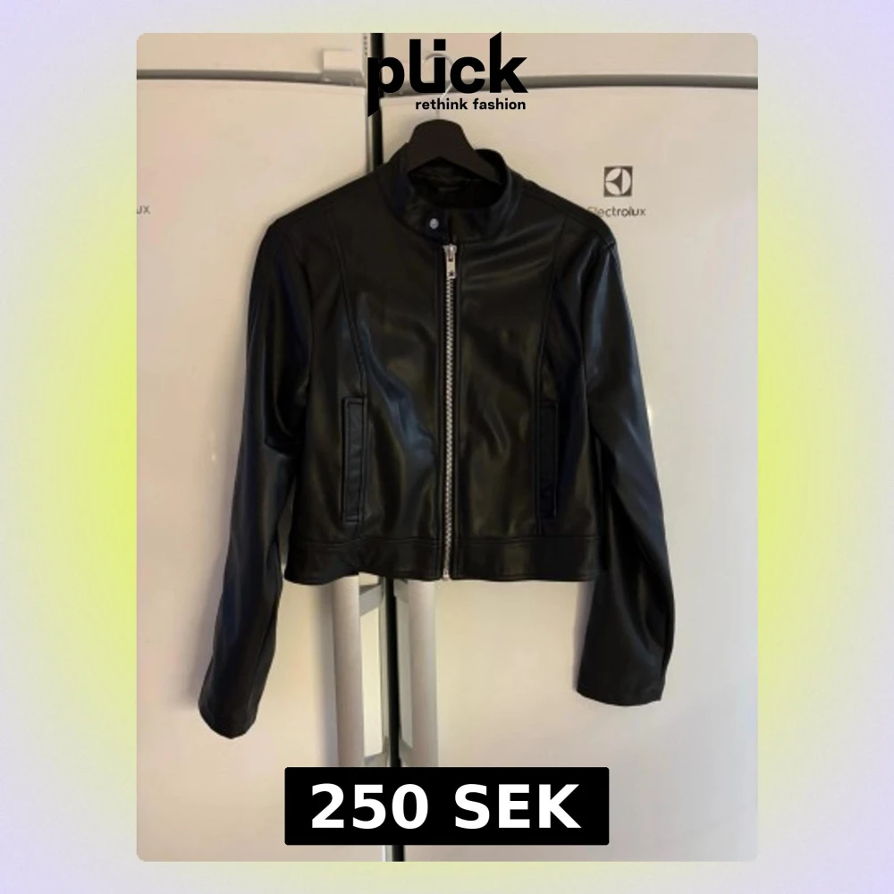 Snygg svart skinnjacka med croppad passform och raka linjer. Jackan har en hög krage, silverfärgad dragkedja framtill och två fickor. Perfekt för dig som vill ha en stilren och edgy look.