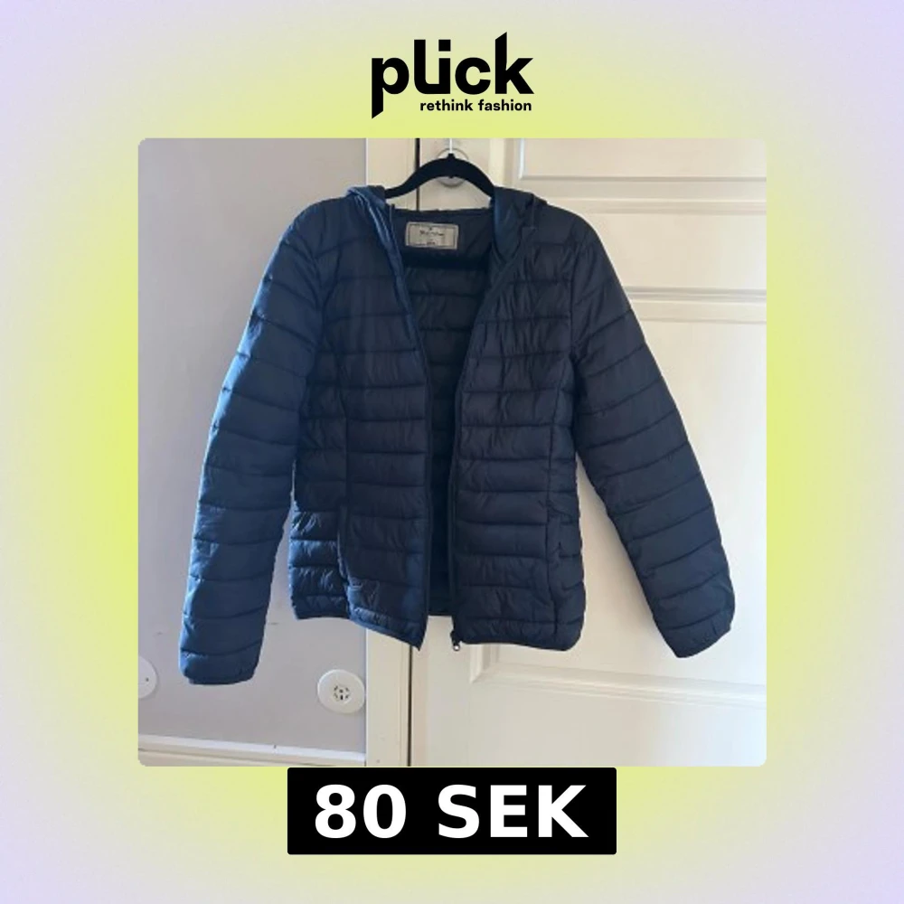Säljer en mörkblå pufferjacka från Blue Motion i storlek S. Jackan har huva, dragkedja framtill och två sidofickor.