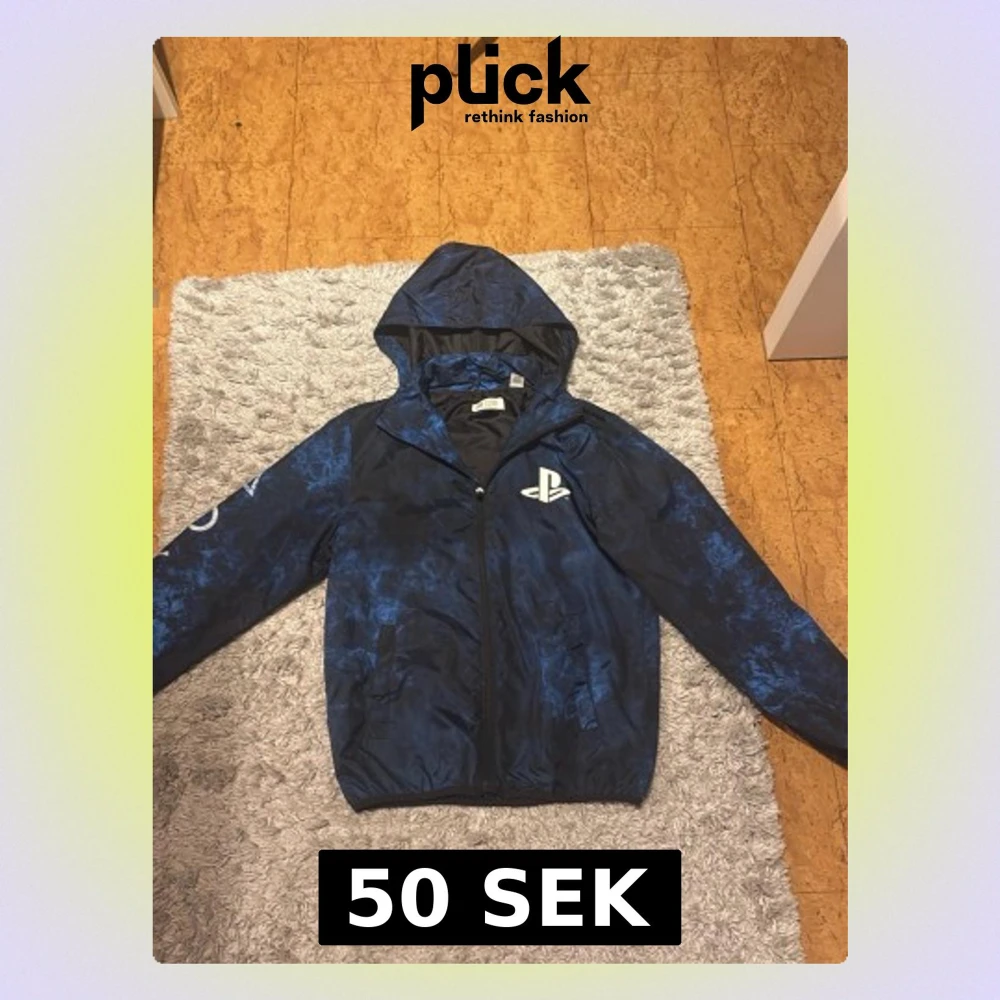 Säljer en blå och svart PlayStation vindjacka från H&M med coolt mönster och stora PlayStation-loggor på bröstet, ryggen och ena ärmen. Jackan har huva, dragkedja och två fickor framtill. Perfekt för dig som älskar gaming och vill sticka ut.