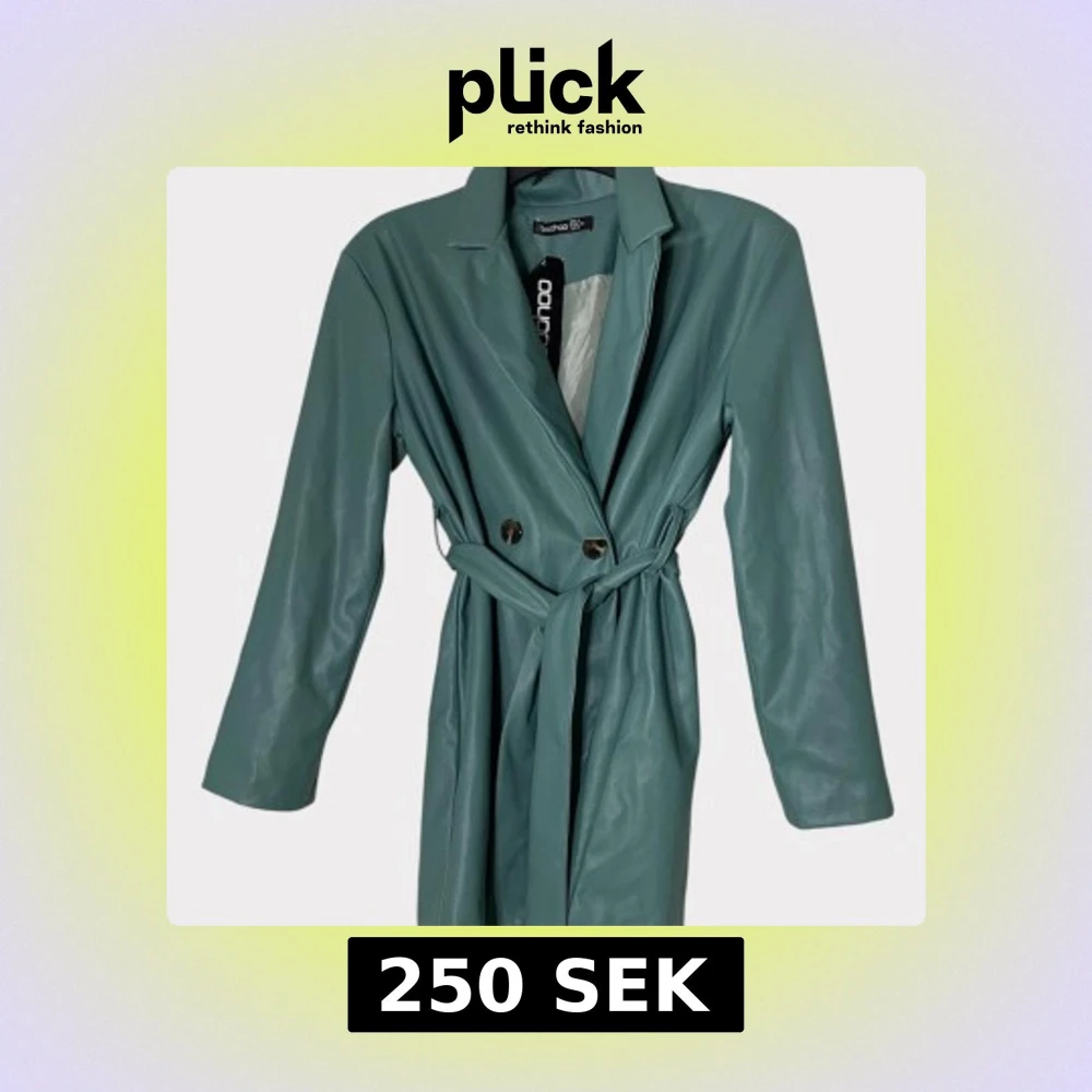 Trendigt grön trenchcoat i skinnimitation från Boohoo. Jackan har långa ärmar, knytskärp i midjan och dubbla knappar framtill. Snygg krage och stilren design som ger en cool vibe. Perfekt för dig som vill sticka ut med en unik jacka. (Passar mig som har storlek 36-38)