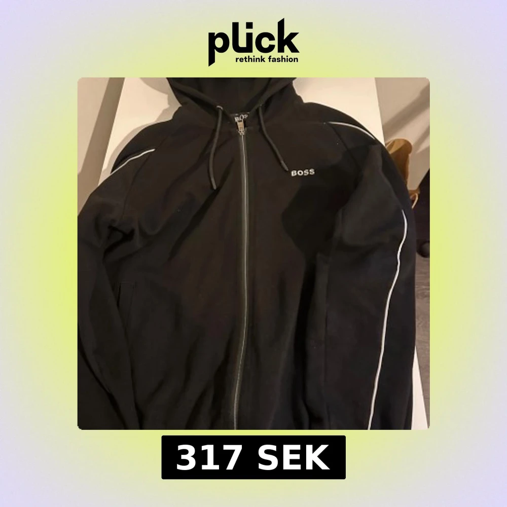 Svart hoodiejacka från BOSS med hel dragkedja, huva med snörning och vita detaljer längs ärmarna. Jackan har broderad BOSS-logga på bröstet och är tillverkad i mjuk bomull. Perfekt för en chill och stilren look.