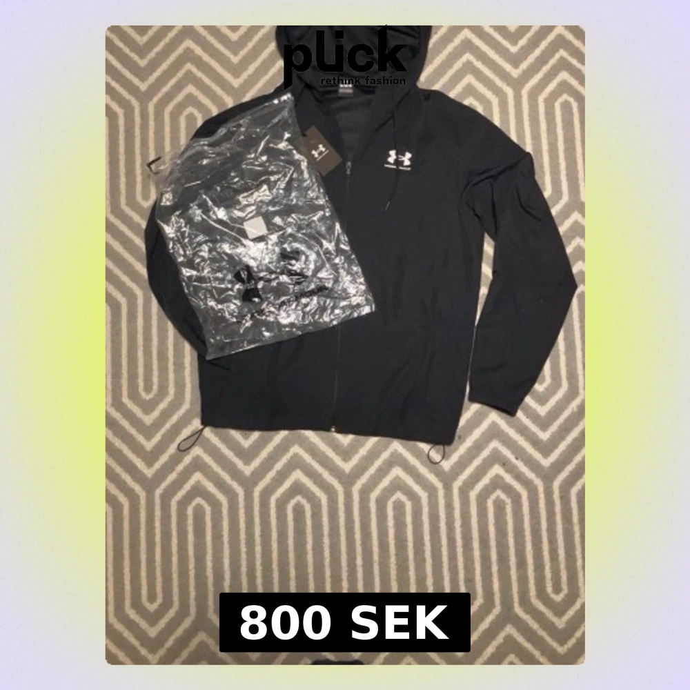 Snygg svart vindjacka från Under Armour med huva och dragkedja framtill. Jackan har logga på bröstet och justerbara snören i nederkant. Tillverkad i lätt polyester som passar perfekt till träning eller när du vill ha en sportig look. Helt ny använt bara en gång. Priset kan diskuteras, först till kvarn!