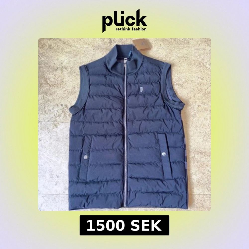 Stilren svart dunväst från Burberry med klassiskt rutigt mönster på ryggen. Västen har hög krage, dragkedja framtill och två fickor med knappstängning. Perfekt för lager-på-lager och snygg detalj med Burberry-logga på bröstet.