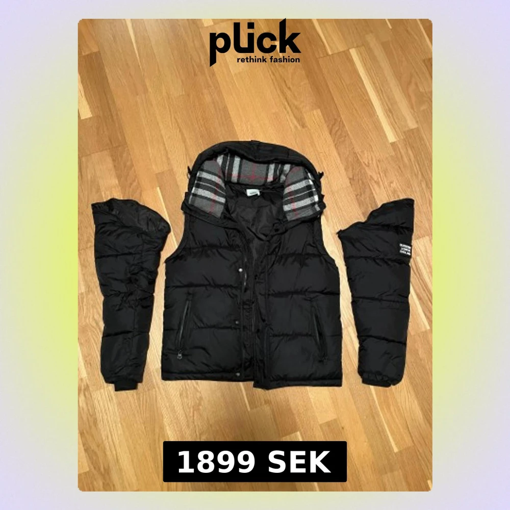 Säljer en svart dunjacka från Burberry London England med avtagbara ärmar så den kan användas som väst. Jackan har rutigt grått innerfoder med röda och svarta detaljer, dragkedja och knappar framtill samt huva. Klassisk Burberry-logga på ärmen. Rikgtigt skön och varm och perfekt inför de kalla tiderna