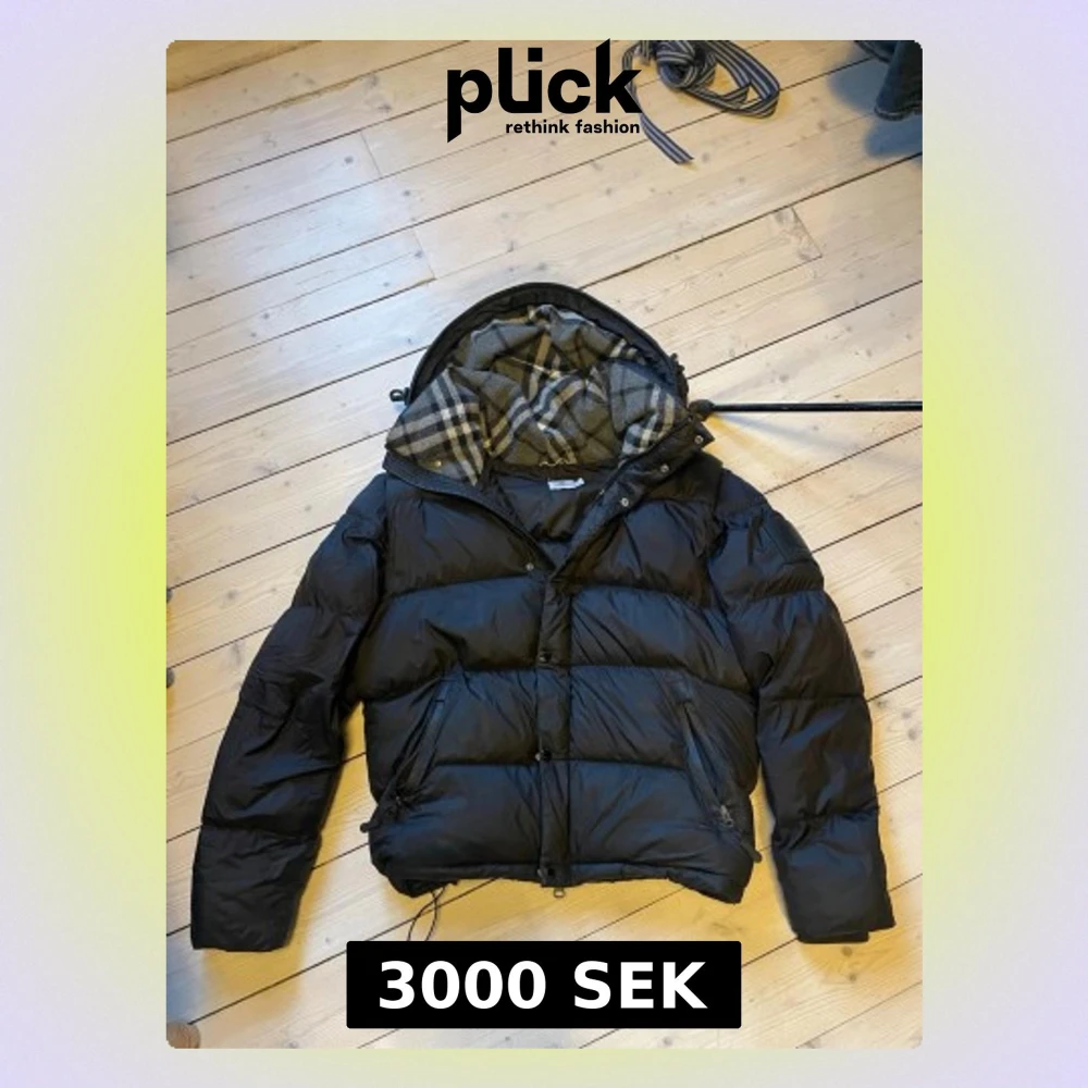 Svart burberry jacka med avtagbara ärmar och huva med grått rutigt foder. Jackan har dragkedja och knappar framtill samt två fickor med dragkedja. Perfekt för kalla dagar och kan användas som väst. Snygg och praktisk design. Har tyvär dock 2 små hål i ärmen.
