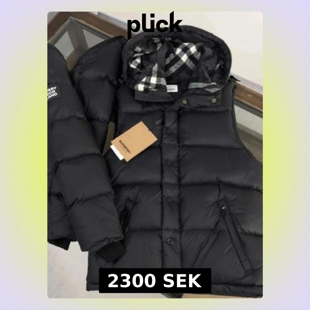 Svart pufferjacka från Burberry med rutigt foder i huvan. Jackan har både dragkedja och knappar framtill, samt två sidofickor med dragkedja. Klassisk Burberry-logga på ärmen och quiltad design. Perfekt för kalla dagar och riktigt snygg stil.