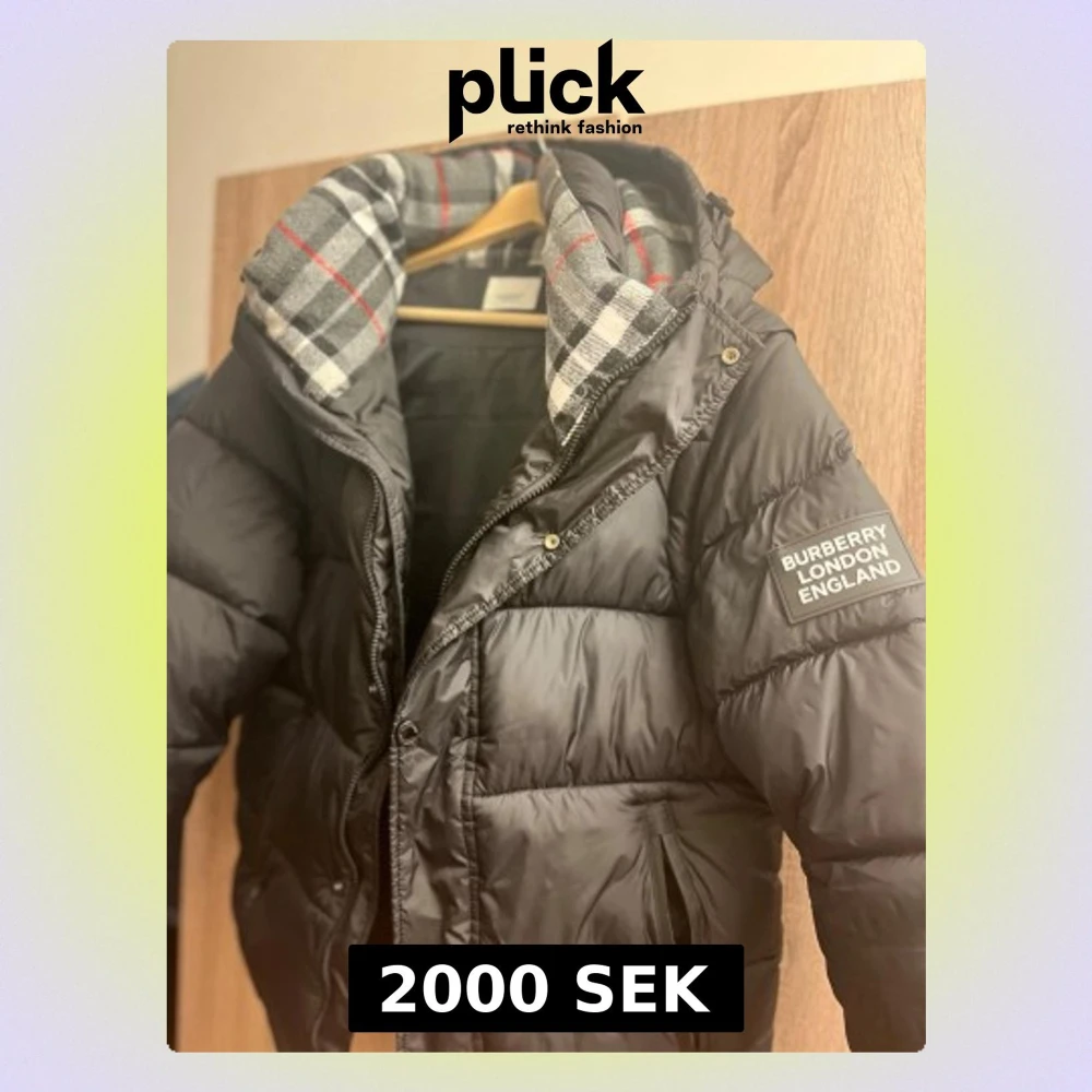 Säljer en svart pufferjacka från Burberry med stor patch på ärmen och en snygg rutig krage i grått, vitt och rött. Jackan har dragkedja, knappar och två fickor med dragkedja. Perfekt för kalla dagar och har en riktigt schysst streetstil.