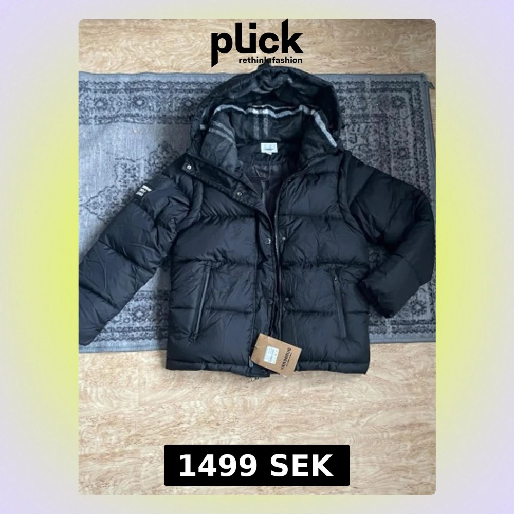 Svart pufferjacka från Burberry med avtagbara ärmar så du kan bära den som väst. Jackan har huva med rutigt foder, två dragkedjefickor fram och stängs med både dragkedja och knappar. Perfekt för kalla dagar och har en riktigt snygg streetstil.