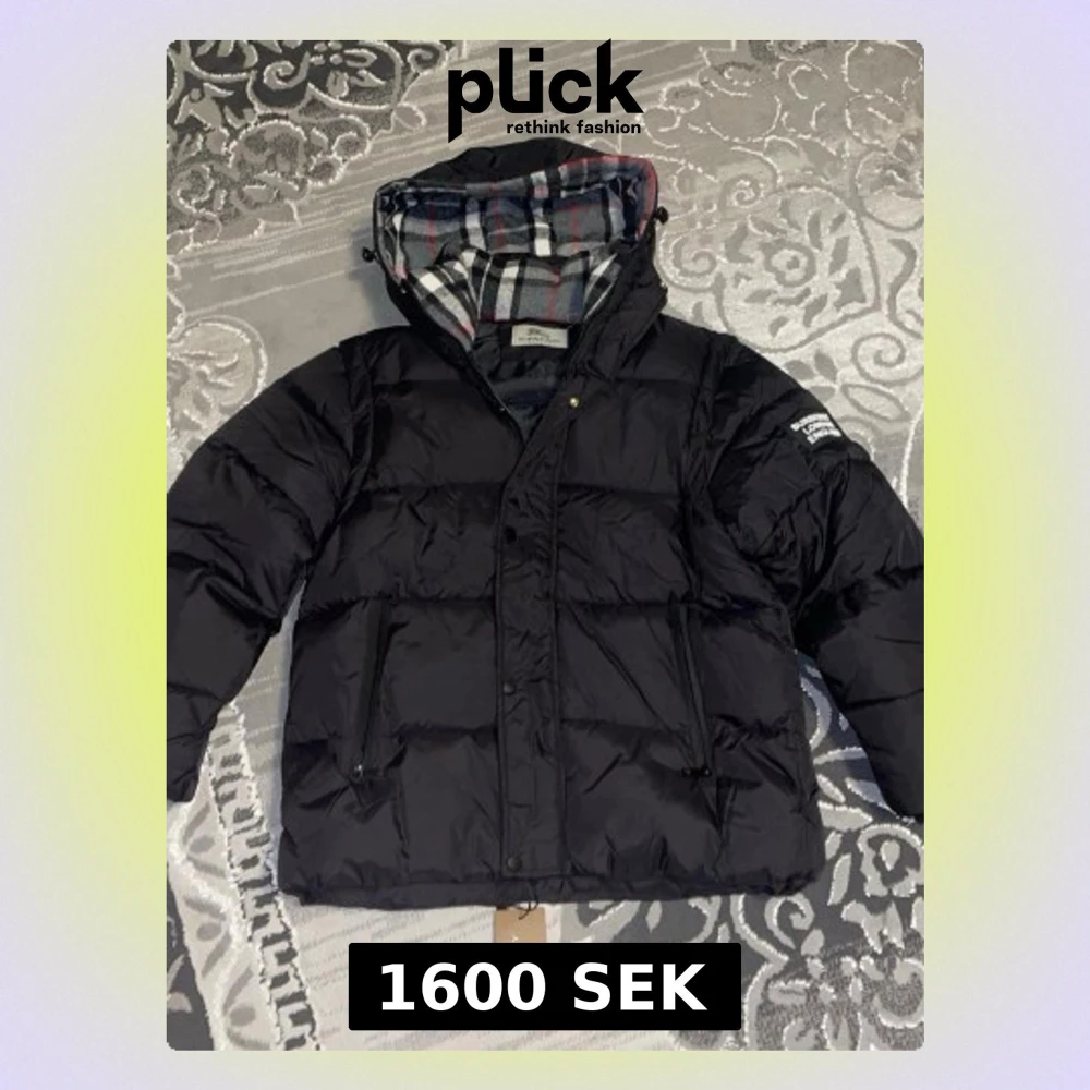 Svart pufferjacka från Burberry med klassisk rutig huva i grått, vitt och rött. Jackan har dragkedja, knappar och två fickor med dragkedja. Märke med 'Burberry London England' på ärmen. Perfekt för kalla dagar och har en riktigt snygg street vibe.