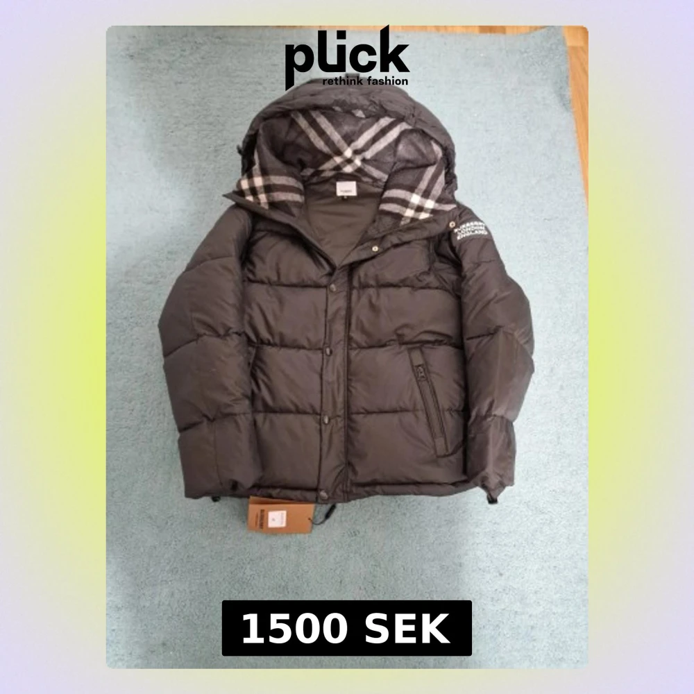 Svart pufferjacka från Burberry med klassisk rutig insida på huvan. Jackan har dragkedja och knappar framtill, samt en ficka med Burberry-detaljerad dragkedja. Fylld med dun och har en loose passform, perfekt för kalla dagar.