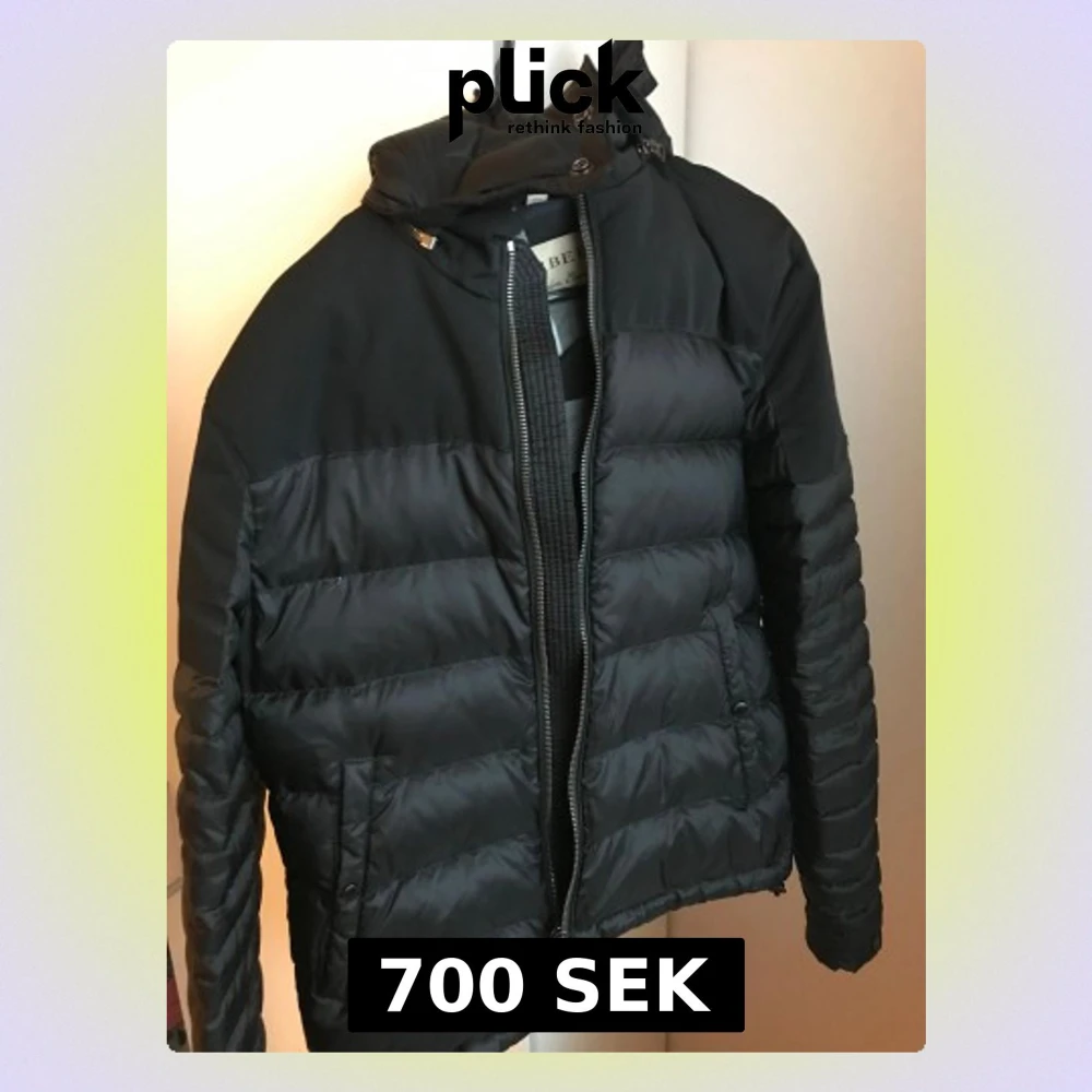 Säljer en svart pufferjacka från Burberry med klassiskt rutigt foder. Jackan har huva med knappar, två sidofickor och dragkedja framtill. Materialet är polyester och dun, perfekt för kalla dagar. Snygg och stilren design med Burberrys ikoniska detaljer.