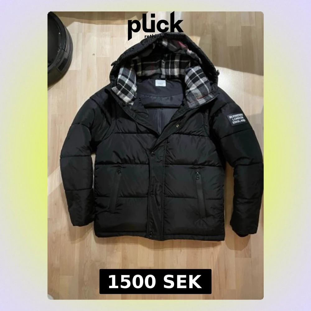 Säljer en svart pufferjacka från Burberry med stor huva och rutig fodring i svart, vitt och lite rött. Jackan har dragkedja, knappar och två fickor med dragkedja. Märke på ärmen med texten 'Burberry London England'. Perfekt för kalla dagar. Jackan är använd endast 1 gång och är som ny. Hör av er vid frågor