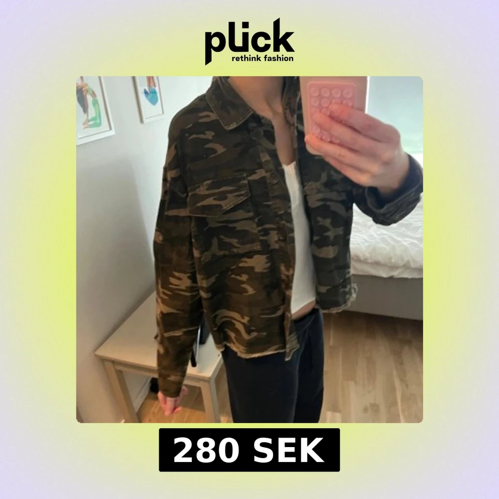 Säljer en cool camouflagejacka med en avslappnad passform. Jackan har långa ärmar och knappar framtill. Perfekt för en trendig look.