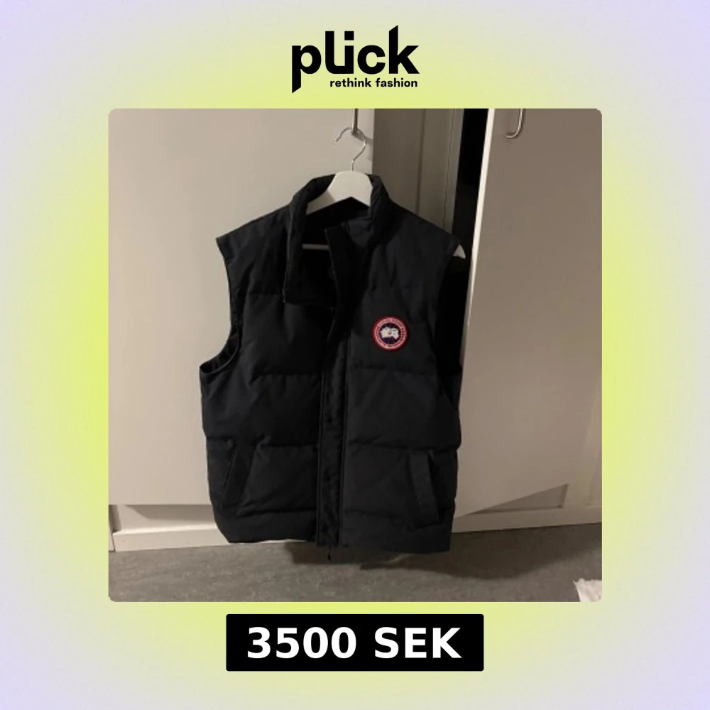 Svart dunväst från Canada Goose med klassisk logga på bröstet. Västen har två stora fickor framtill och stängs med både dragkedja och tryckknappar. Perfekt för lager-på-lager och riktigt snygg till streetwear. Kan även tänka mig byta mot en mindre storlek (Medium)