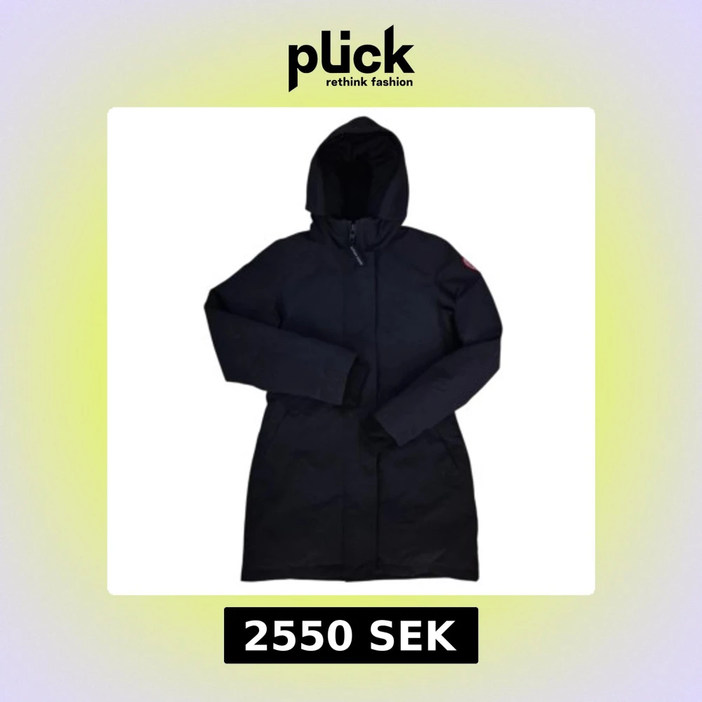 Säljer en svart lång dunjacka från Canada Goose med huva och dragkedja. Jackan har quiltad insida, två fickor och klassisk logga på ärmen. Materialet är polyester och bomull på utsidan, dunfyllning för extra värme. Perfekt för kalla dagar och snygg stil.