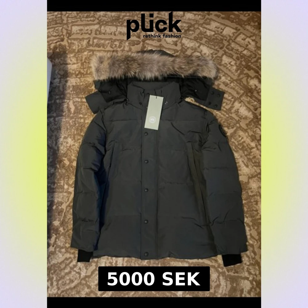 Säljer en grå dunjacka från Canada Goose i storlek L. Jackan har en fluffig äkta päls på huvan, ribbade muddar och knappar framtill. Perfekt för kalla dagar med sin tjocka vaddering och klassiska logga på ärmen. Snygg och funktionell vinterjacka.