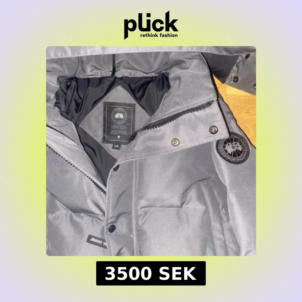 Säljer en stilren grå dunjacka från Canada Goose med avtagbar huva och dragkedja. Jackan har en broderad logga på ärmen och knappar framtill. Perfekt för kalla vinterdagar.