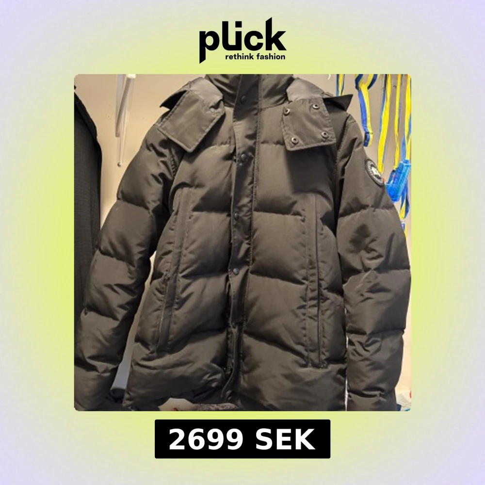 Säljer en svart dunjacka från Canada Goose med deras ikoniska märke på ärmen. Jackan har en hög krage och avtagbar huva, perfekt för kalla dagar. Den är långärmad och har en dragkedja framtill. Storlek M. För fler frågor och bilder skrivs gärna