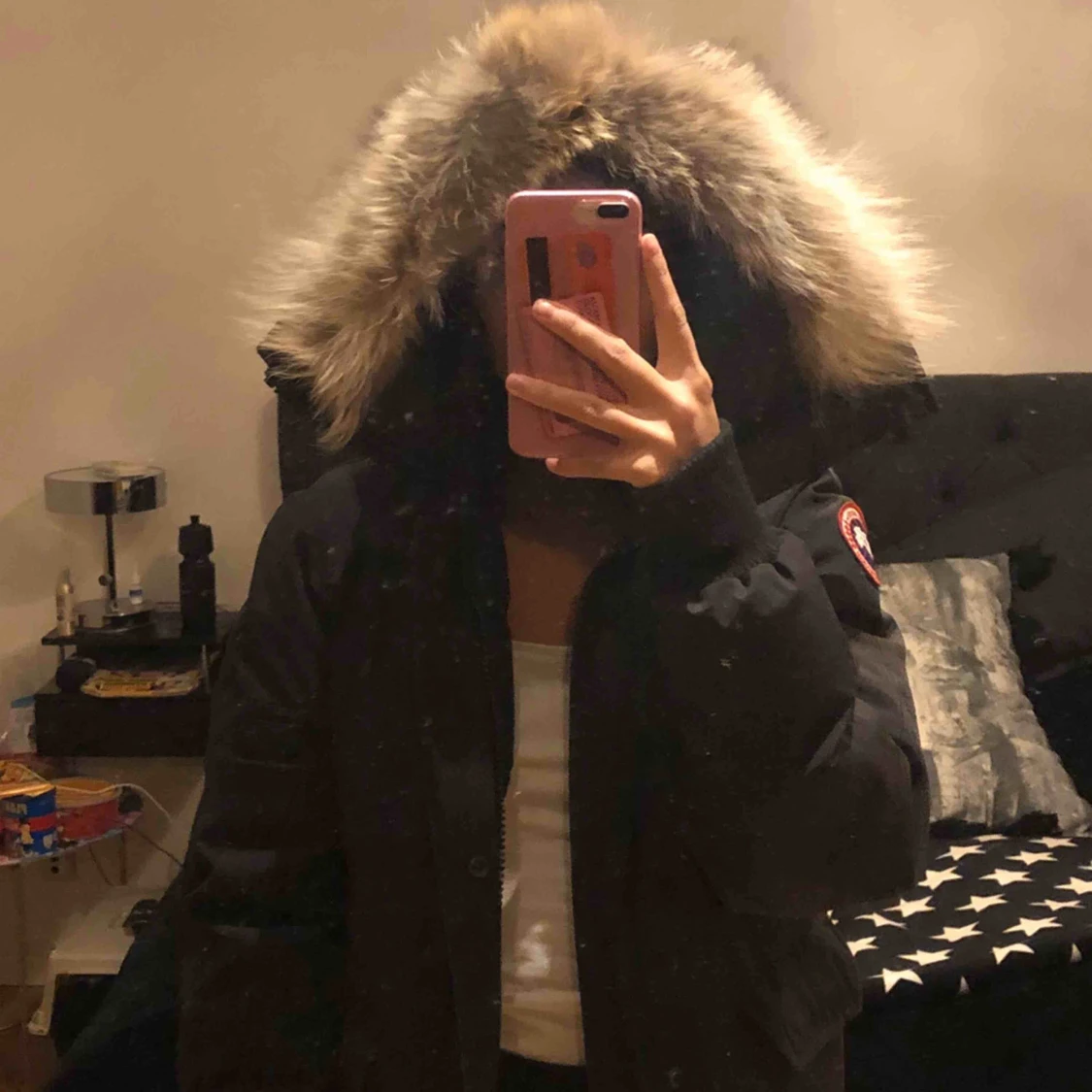 Jackan är lite dammig/smutsig efter att ha hängt & behöver kemtvättas. Samt att muddarna är slitna, men dem går att byta ut om man vill. Jackan är i strl xs men dem är stora i storleken så passar en S/M också! Kan gå ner i pris vid snabb affär😊