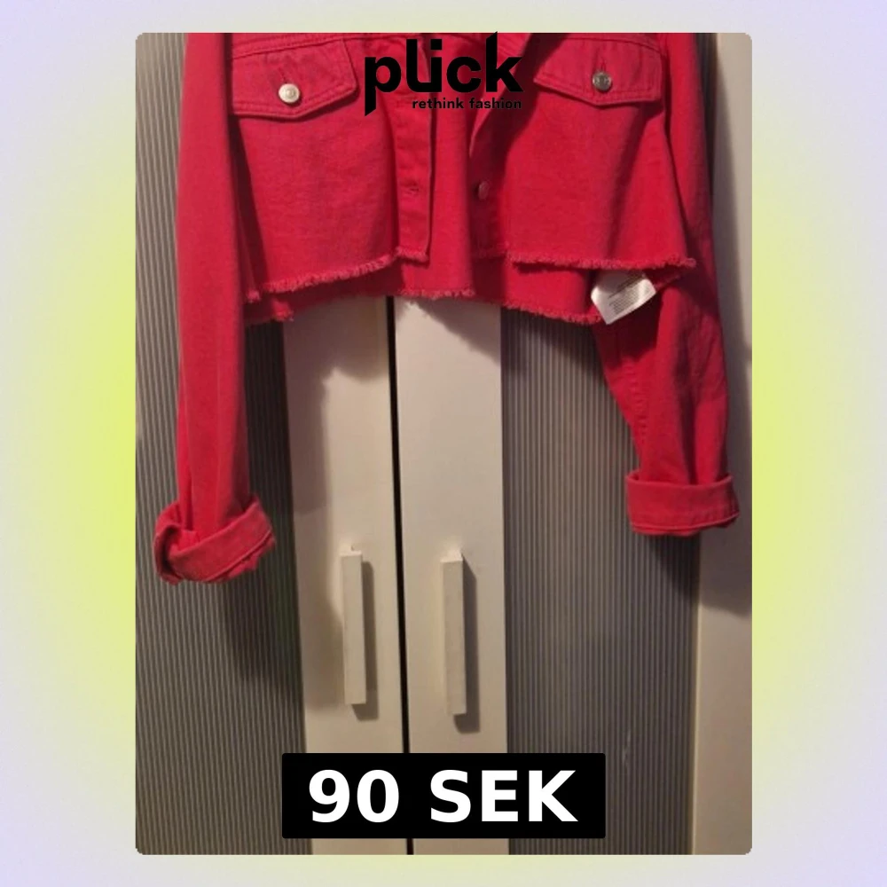 Snygg croppad röd jeansjacka med rå kant och klassiska bröstfickor. Jackan har långa ärmar och knappar framtill. Perfekt för dig som vill sticka ut med en färgstark och trendig look. På bilden ser den typ röd ut men den är chockrosa. Fins katt i hemmet