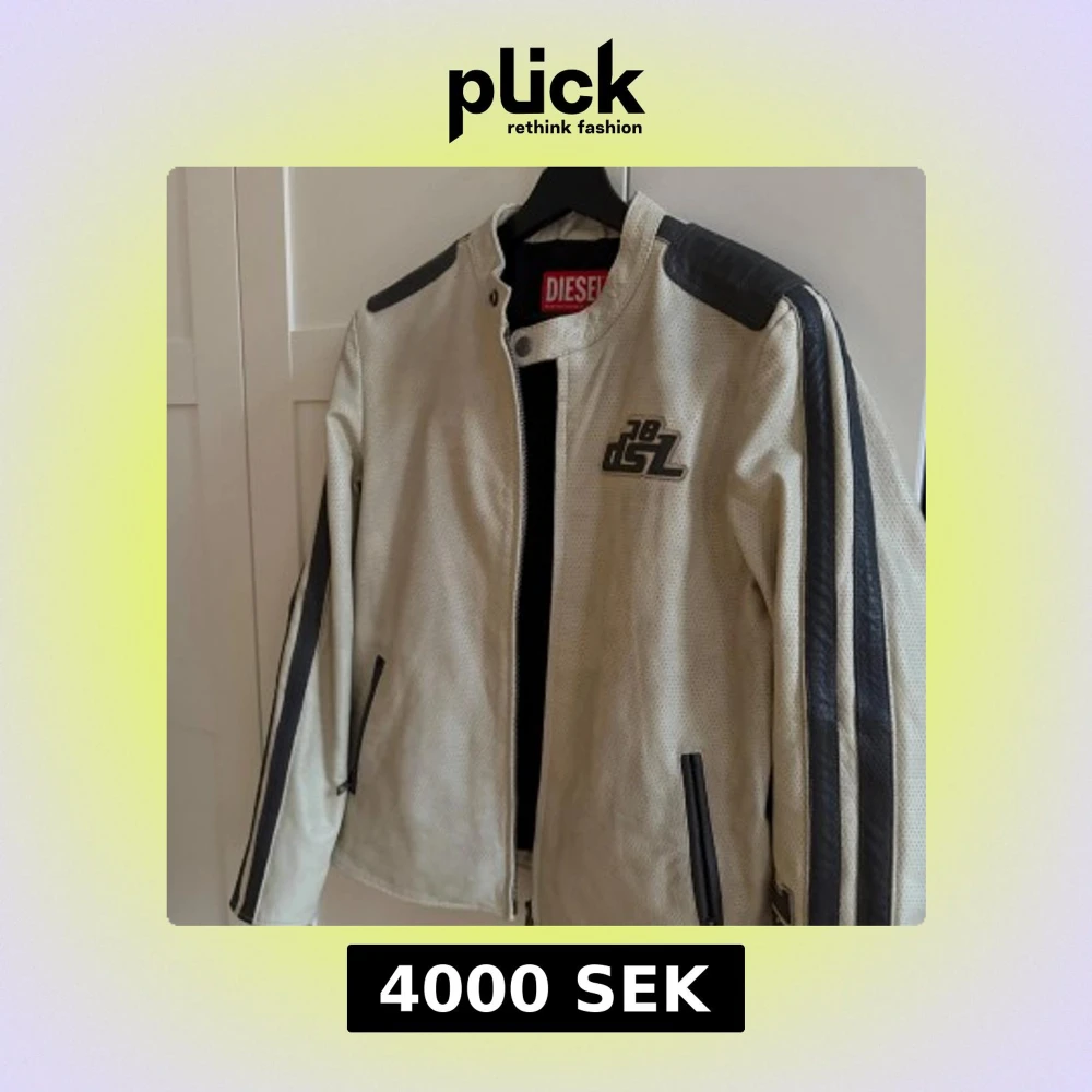 Riktigt snygg vit skinnjacka från Diesel med svarta axelpartier och ränder längs ärmarna. Jackan har perforerat skinn, dragkedja framtill och coola Diesel-loggor både fram och bak. Perfekt för dig som vill sticka ut med en sportig och edgy look. Är endast använd 1 gång. NYPRIS: 8000kr