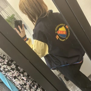 Djurgårdsjacka i collegestil, skulle säga att den är en L/XL kanske men tycker det blir en perfekt oversize passform på mig som normalt sätt har M i överdelar.
