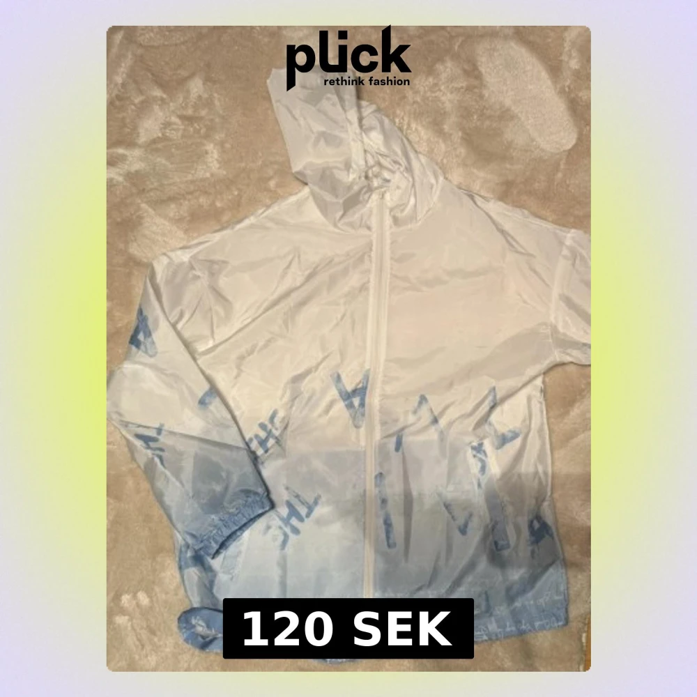 Säljer en tunn vindjacka i vitt och ljusblått med huva och hel dragkedja framtill. Jackan har tryckta bokstäver och textdetaljer i blått, samt resår vid ärmsluten. Perfekt för blåsiga dagar och enkel att slänga på sig.