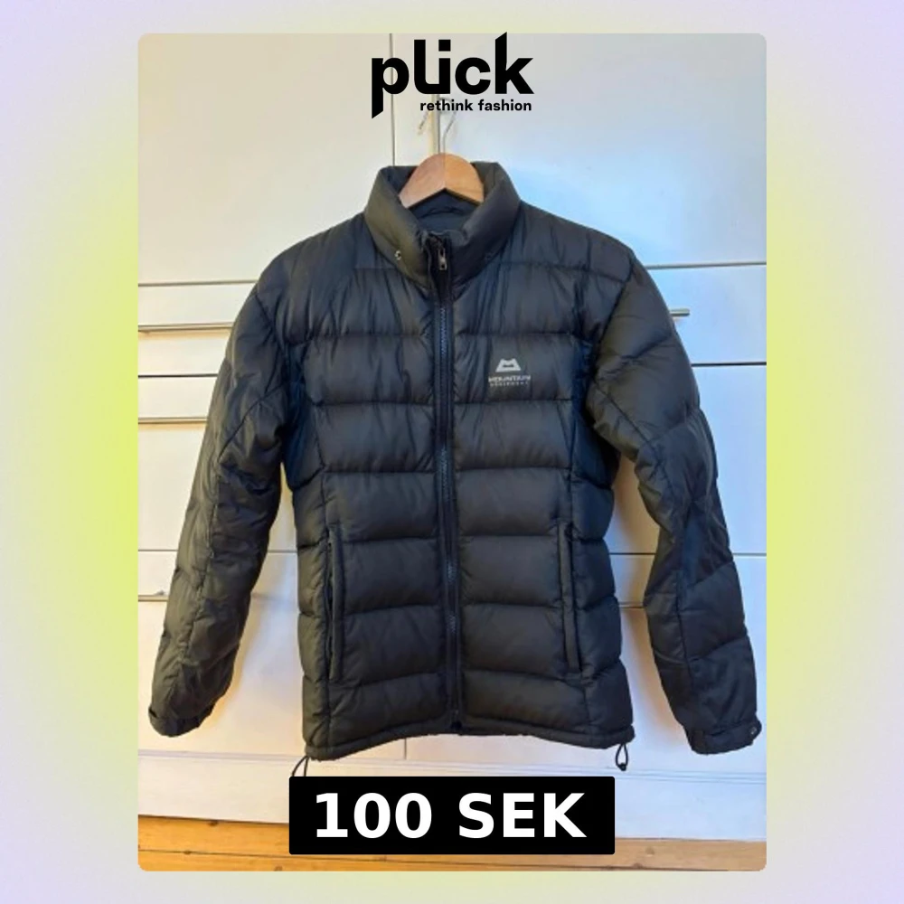 Svart pufferjacka i dun från Mountain Equipment. Hög krage. Avtagbar luva (ej på bild men finns!) Logga på bröstet. Justerbar nederkant och ärmslut. Sidofickor med dragkedja. OBS dragkedja trasig i en av fickorna + ett hål på vardera ärm - se bilder. Storlek UK 8/XS