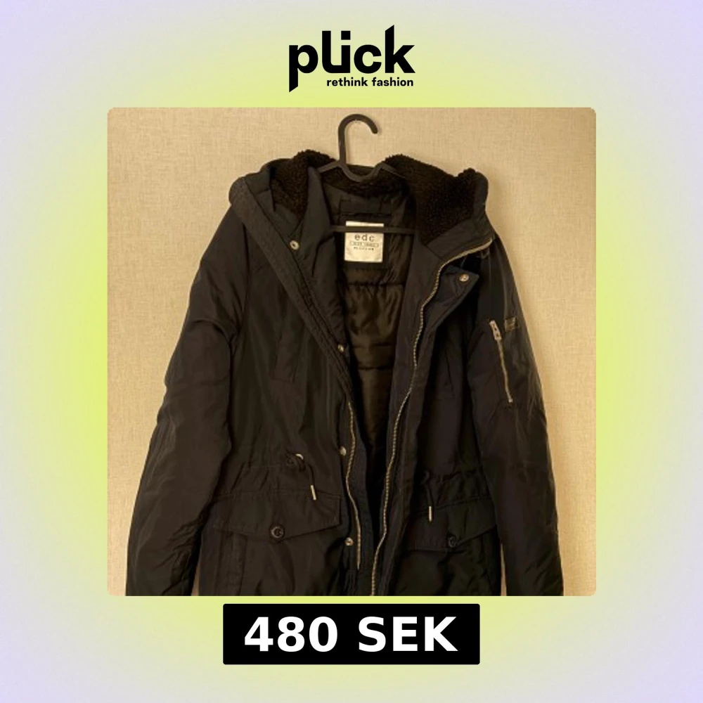 Svart parkajacka från edc med huva och mysigt foder. Jackan har flera fickor, både med dragkedja och knappar, samt snörning i midjan för snygg passform. Perfekt för kyliga dagar och har en stilren look som funkar till det mesta.