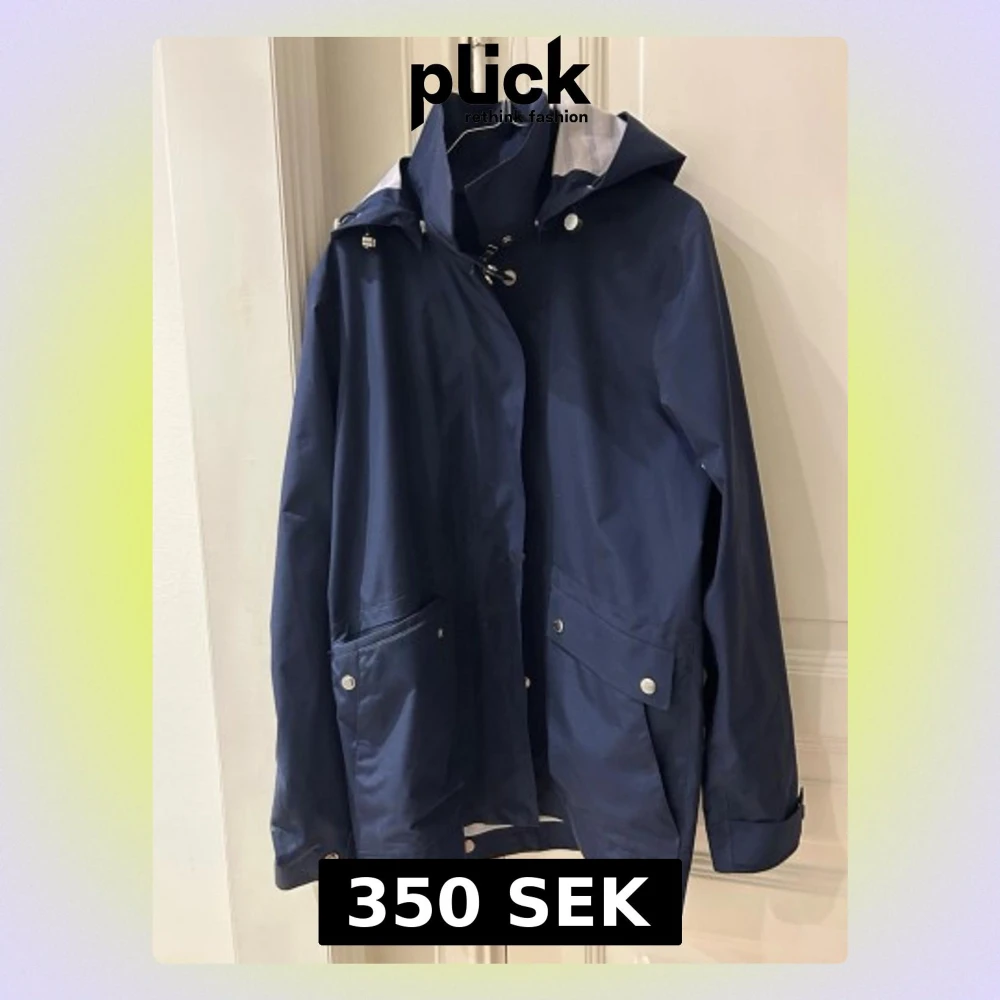 Säljer en mörkblå regnjacka från GANT i storlek medium. Jackan har huva, silverfärgade tryckknappar och stora fickor framtill. Materialet är syntet och jackan har en clean, stilren look som funkar till alla outfits. Perfekt för blöta dagar!
