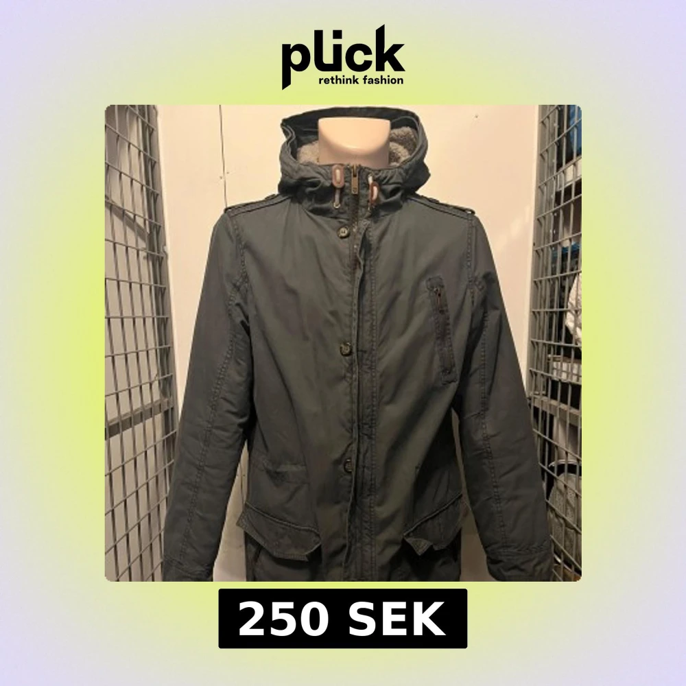 Säljer en grå parkajacka med mysigt teddyfoder. Jackan har en dragkedja och knappar framtill, samt flera praktiska fickor. Perfekt för kyliga dagar med sin långa passform och huva.