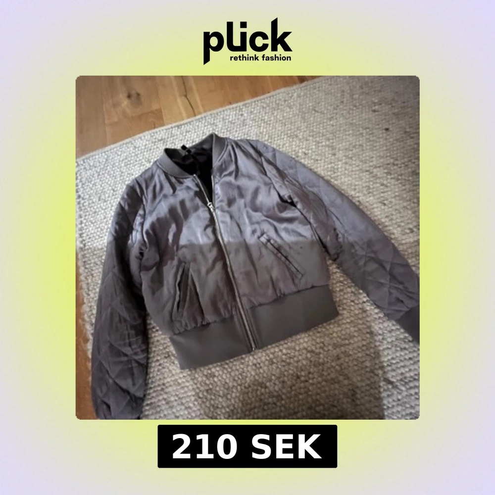 Säljer en grå bomberjacka med quiltade ärmar och ribbade muddar. Jackan har dragkedja framtill och två snedställda fickor. Perfekt för dig som gillar en clean och stilren look. Har lite små fläckar