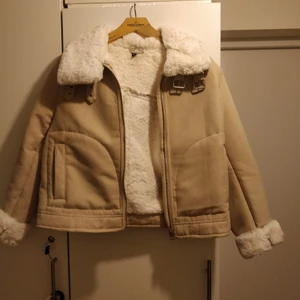 En beige jacka med vitt mysigt foder, fuskpäls! Använd 2 ggr endast. Står storlek 44, men är väldigt liten i storleken. Jag är 38 och den passar bra på mig, men jag gillar den lite oversized också, så beror på vad man gillar!