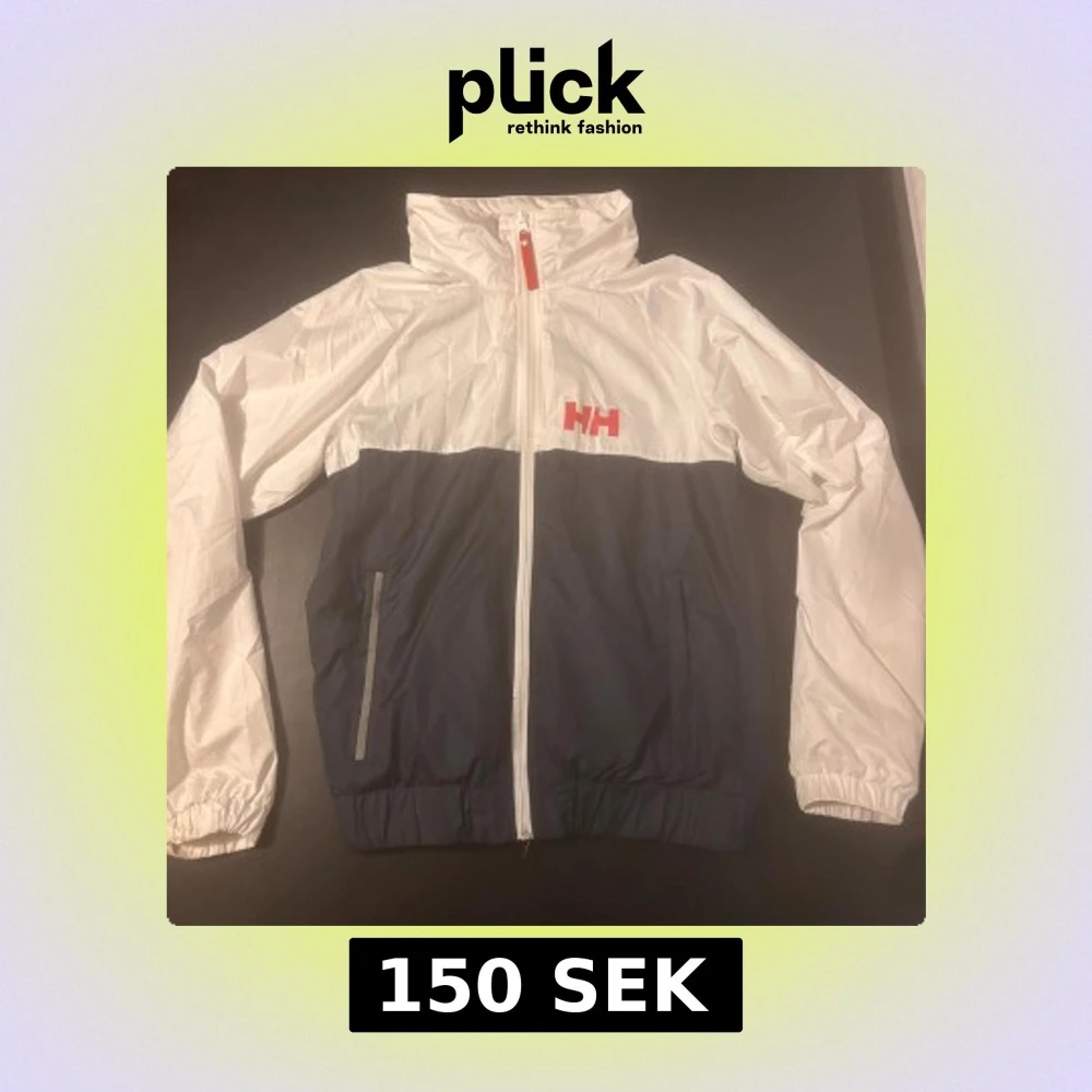 Snygg vindjacka från Helly Hansen i vit och marinblå med röd logga på bröstet och stort HELLY HANSEN-tryck på ryggen.