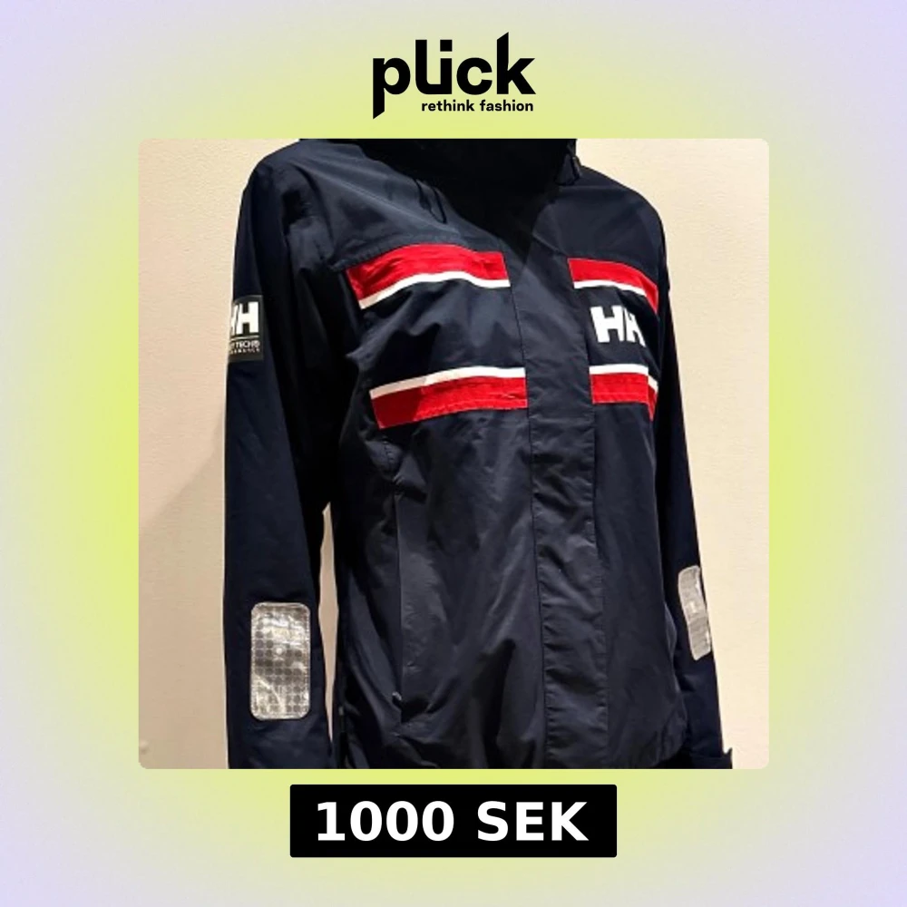 Snygg marinblå vindjacka från Helly Hansen med röda och vita ränder på bröstet och ryggen. Jackan har huva, långa ärmar med reflexdetaljer och HH-logga på ärmen. Perfekt för dig som gillar sportig stil och vill sticka ut med coola färgblock.