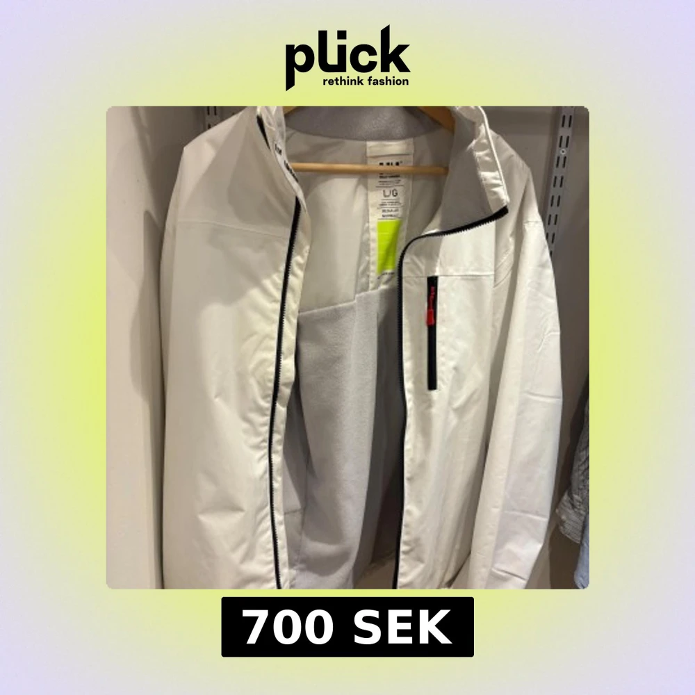 Snygg vit vindjacka från Helly Hansen i storlek L. Jackan har svart dragkedja, bröstficka med röd detalj och grå fleecefoder på insidan. Regular fit och broderad logga på insidan av kragen. Perfekt för blåsiga dagar.
