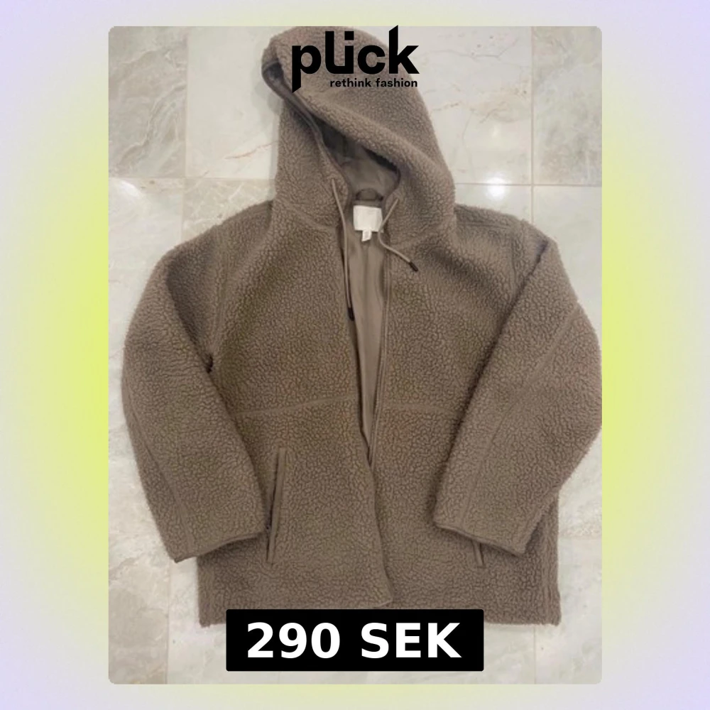 Mysig beige teddyjacka från H&M i storlek M. Jackan har huva med dragsko, dragkedja framtill och två fickor. Perfekt för kyliga dagar och ger en chill vibe med sin oversized look och fluffiga material.