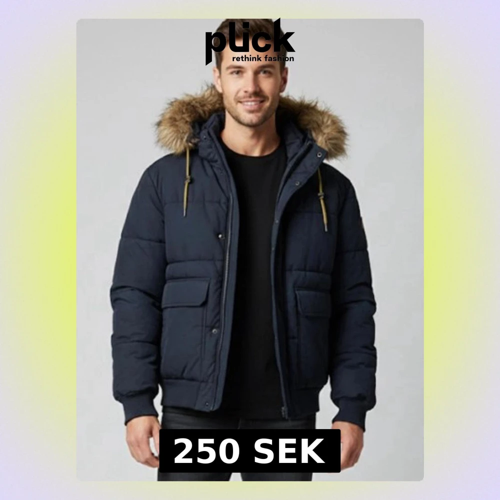 Säljer en mörkblå pufferjacka från H&M med huva och fuskpäls. Jackan har stora fickor framtill, dragkedja och gula snören vid huvan. Perfekt för kalla dagar och riktigt snygg till jeans eller hoodie.