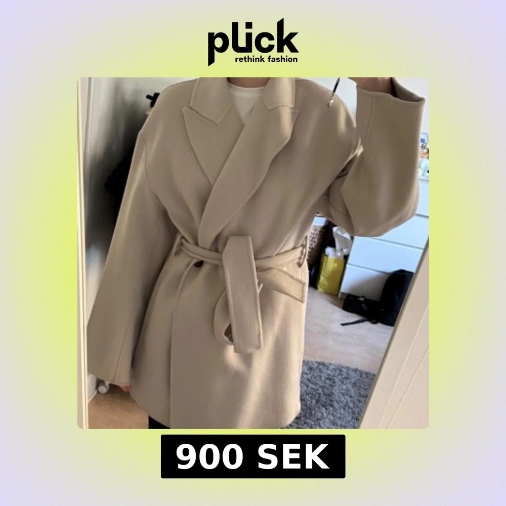 Stilren beige kappa med bred krage, knäppning framtill och matchande bälte i midjan. 50% ull. Använd fåtal gånger. Storlek xs passar även s. Nypris 1599:-