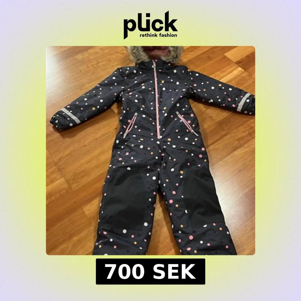 Säljer en härlig mörkblå overall från H&M med färgglada prickar i rosa, vitt och gult. Den har en mjuk och varm fuskpäls runt huvan samt vackra rosa dragkedjor. En perfekt och stilig overall för kyliga dagar!