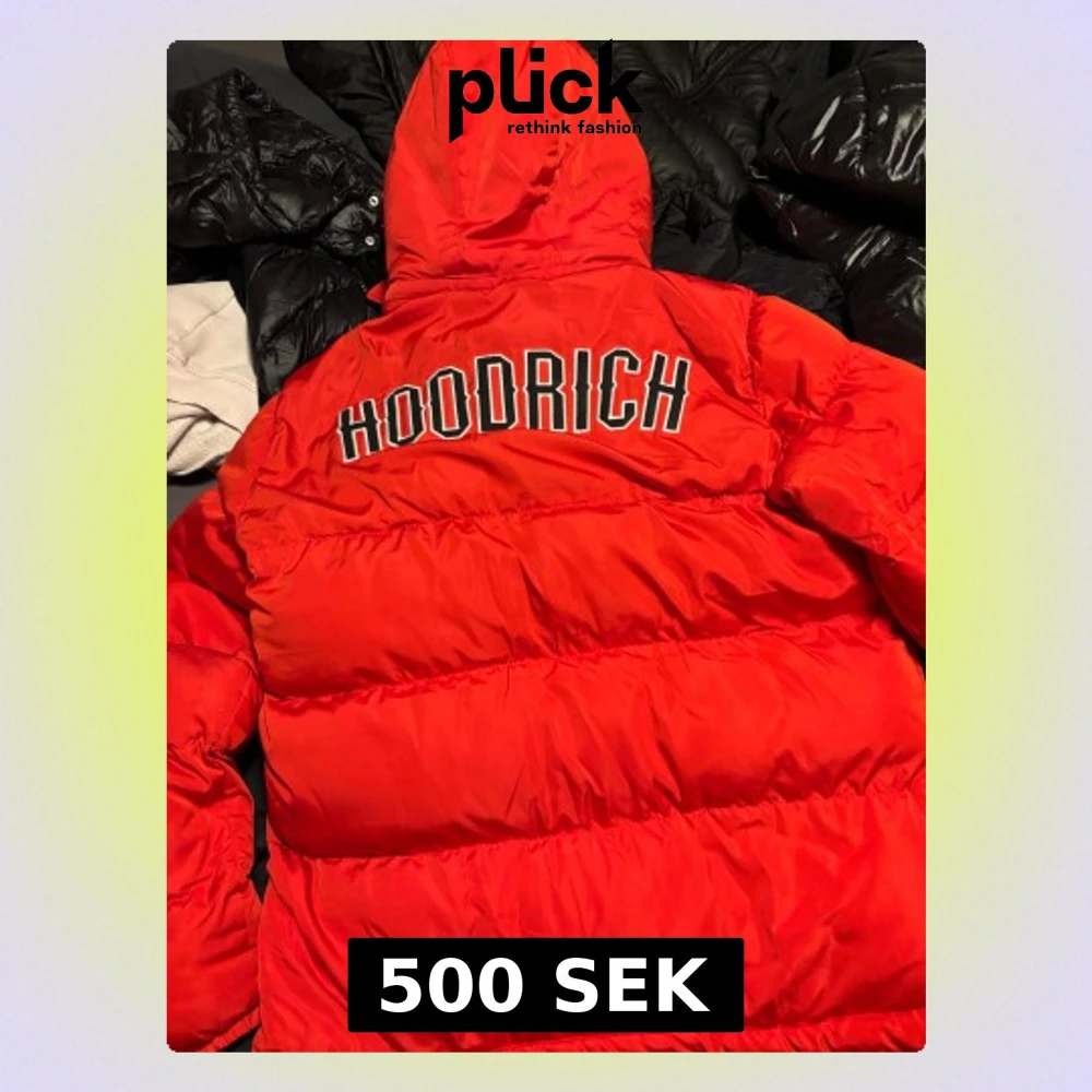 Säljer en fet röd pufferjacka från Hoodrich i storlek M. Jackan har huva, dragkedja framtill och stora fickor. Hoodrich-logga på bröstet och stor text på ryggen.