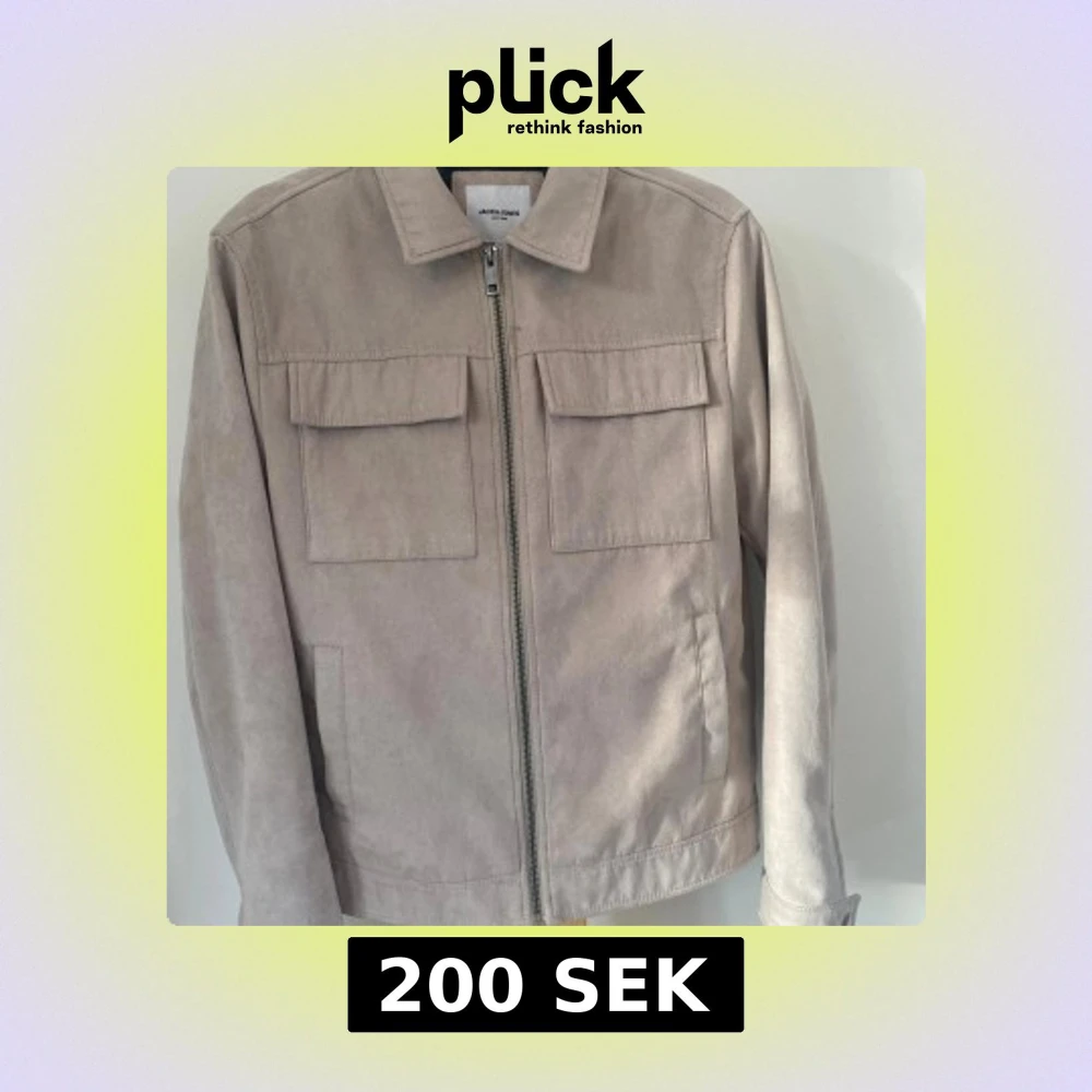 Snygg beige mockajacka från Jack & Jones i storlek S. Jackan har två stora bröstfickor med lock, klassisk krage och dragkedja framtill. Materialet är mjuk mocka och passformen är normal. Perfekt för dig som gillar stilrena och enkla jackor.