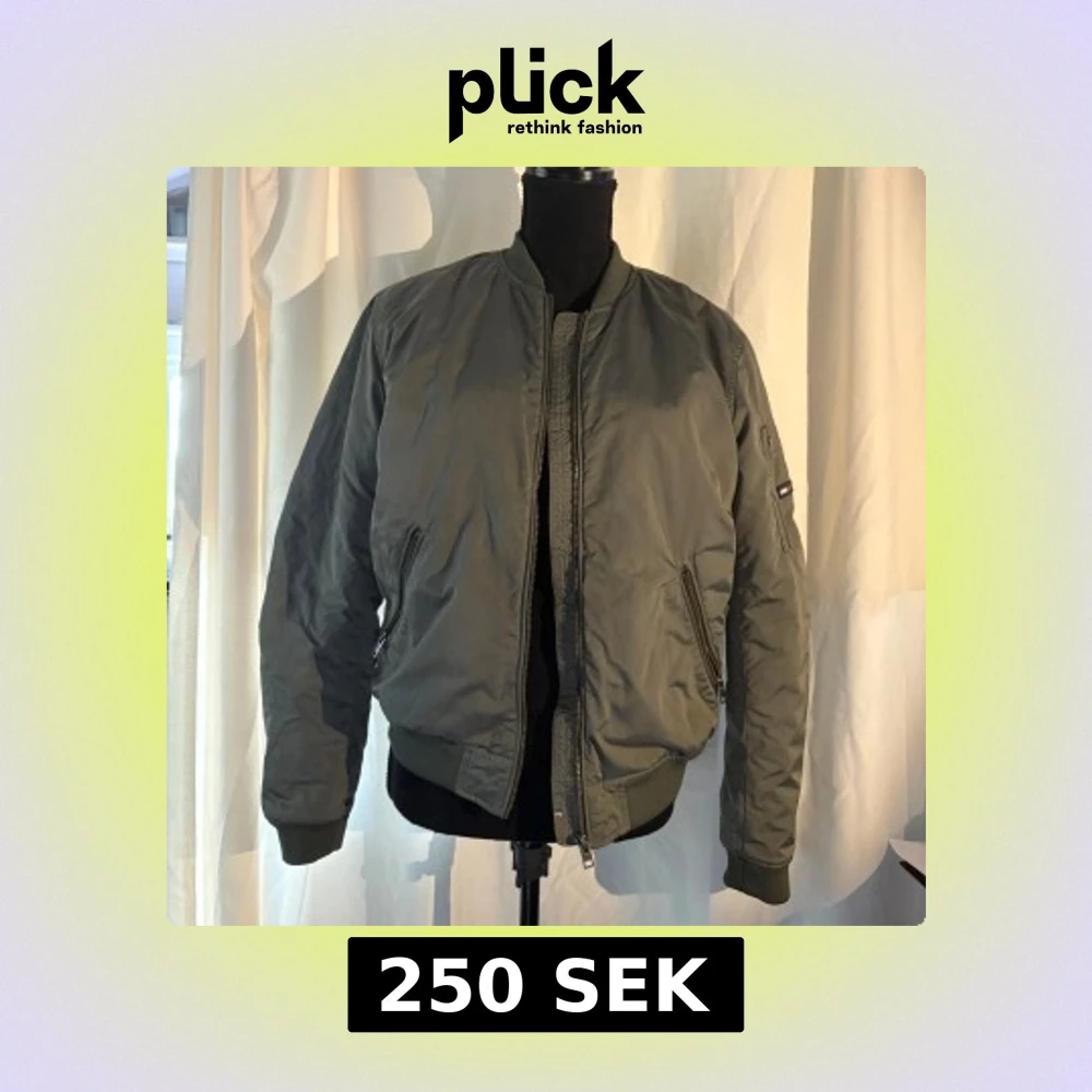 Säljer en snygg grön bomberjacka från Hilfiger Denim. Jackan har en klassisk bomberstil med dragkedja framtill och ribbade muddar vid ärmslut och nederkant. Perfekt för en stilren look.