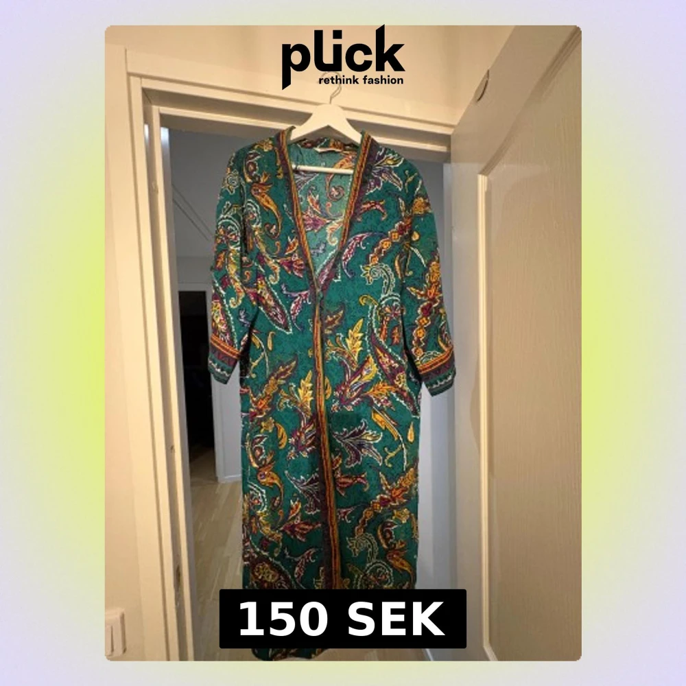 Säljer en färgstark lång kappa med paisleymönster i grönt, gult, lila och rött. Modellen har v-ringad öppning, trekvartsärm och är tillverkad i ett lätt bomullstyg. Perfekt för dig som gillar bohemiska vibes och unika plagg.