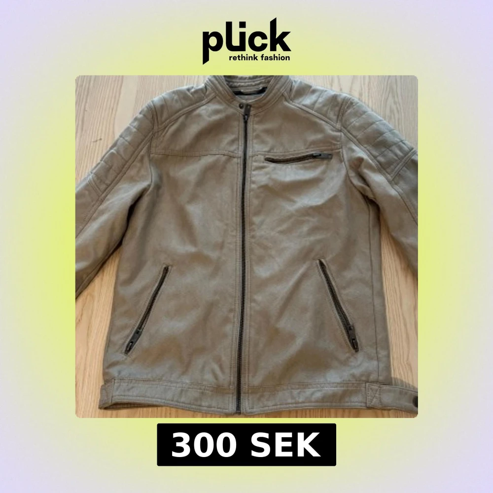 Beige jacka från Jack and Jones med ståkrage och dragkedja framtill. Jackan har tre fickor med dragkedja och diskreta sömdetaljer på axlarna. Säljs för 300kr.