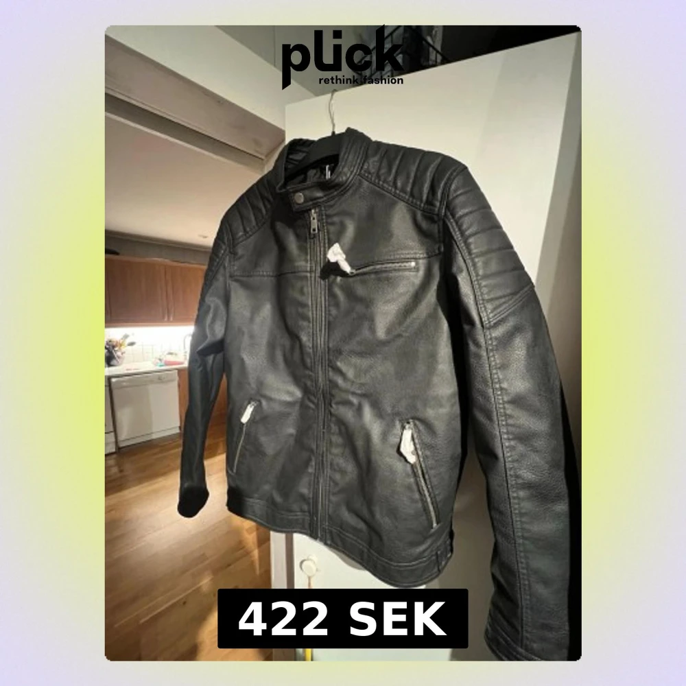 Säljer en svart skinnjacka från Jack & Jones i storlek L. Jackan har coola detaljer som dragkedjor på fickorna, quiltade axelpartier och ståkrage med tryckknapp. Materialet är syntetiskt skinn (PU) och jackan har en clean, modern look.