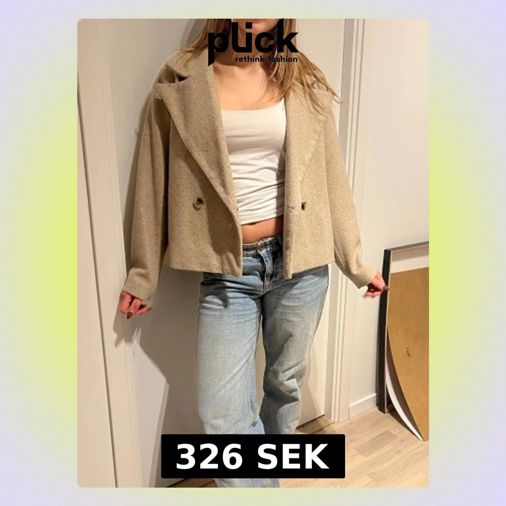 Trendig croppad kavajjacka i beige med breda slag och dubbelknäppning framtill. Jackan har en loose passform och är tillverkad i ett ull-liknande material som ger en mjuk och stilren look. Perfekt att slänga över en enkel topp för en snygg outfit.