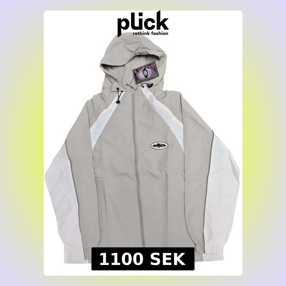 Snygg vindjacka från Corteiz i ljusgrått med vita paneler längs ärmarna. Jackan har huva med snörning, hel dragkedja framtill och elastiska muddar. Liten logga på bröstet och diskret broderad text på ryggen. Perfekt för en stilren och sportig look.