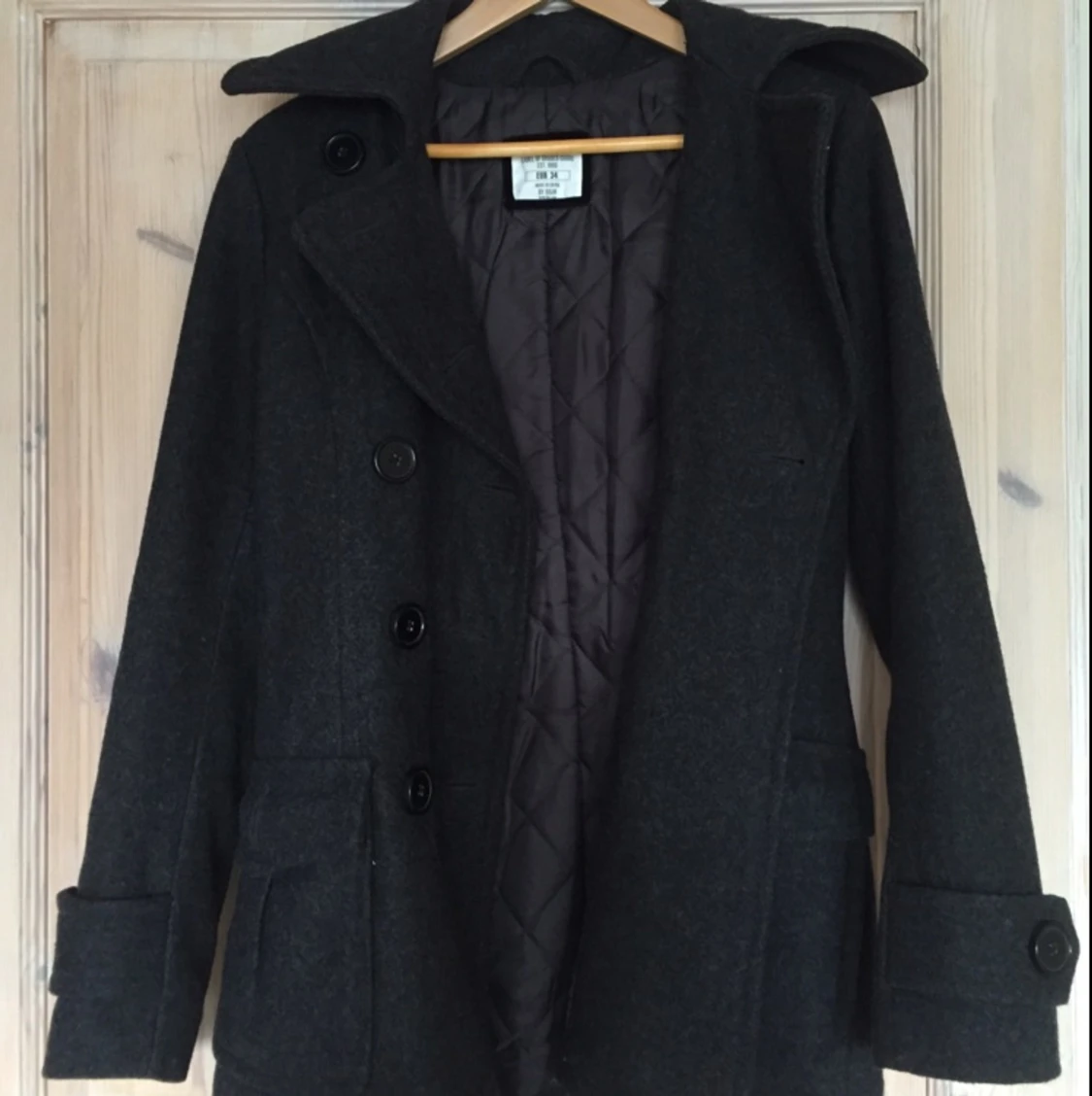 Snygg höst/vår jacka från H&M i storlek 34. Grå/svart figursydd med krage och två fickor fram samt stora knappar fram och längst ned på armarna. Mycket sparsamt använd.