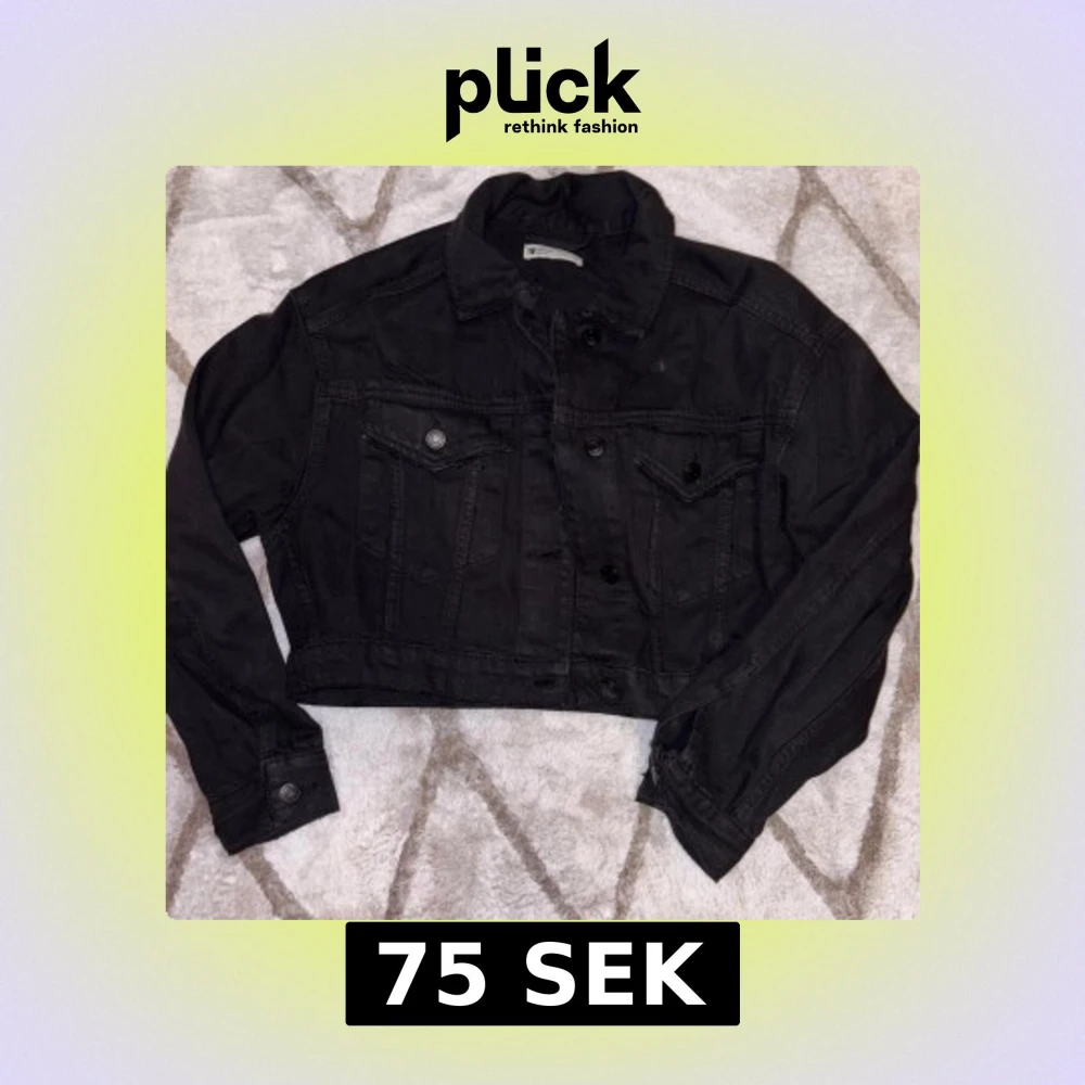 Snygg svart croppad jeansjacka med knappar framtill och två bröstfickor. Perfekt för en cool och avslappnad stil. Jackan har långa ärmar och en klassisk krage.